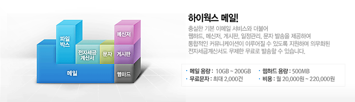 °èÁ¤´ç ÃÖ¼Ò 1GB ¸ÞÀϰø°£À» Á¦°øÇϹǷΠ³Ë³ËÇÏ°Ô »ç¿ëÇÏ½Ç ¼ö ÀÖ½À´Ï´Ù. ³» µµ¸ÞÀÎÀ» ¿¬°áÇØ¼ »ç¿ë ÇÒ °æ¿ì, ³»ºÎ »ç¿ëÀÚ ¸ÞÀÏ ÁÖ¼Ò¸¦ <ID@°í°´µµ¸ÞÀÎ>·Î Á¦°øÇϹǷÎ, °í°´»çÀÇ ´ë¿Ü À̹ÌÁö°¡ ÇÑÃþ ³ô¾ÆÁý´Ï´Ù. ¶ÇÇÑ °í°´´Ô¸¸À» À§ÇÑ ÇÏÀÌ¿÷½º Àü¿ë»çÀÌÆ®¸¦<http://hiworks.°í°´µµ¸ÞÀÎ>¸¦ Á¦°øÇÕ´Ï´Ù. |